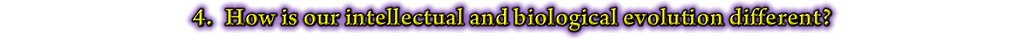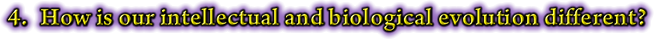 One of the big differences is the rate at which they evolve. Our biological evolution has been going on for millions of year before our intelligence got started. Like other creatures our intellectual evolutionary development got off to a slow start but is has been accelerating recently. Our current stage of intellectual development has got to be one of the most challenging and critical in determining our species future.